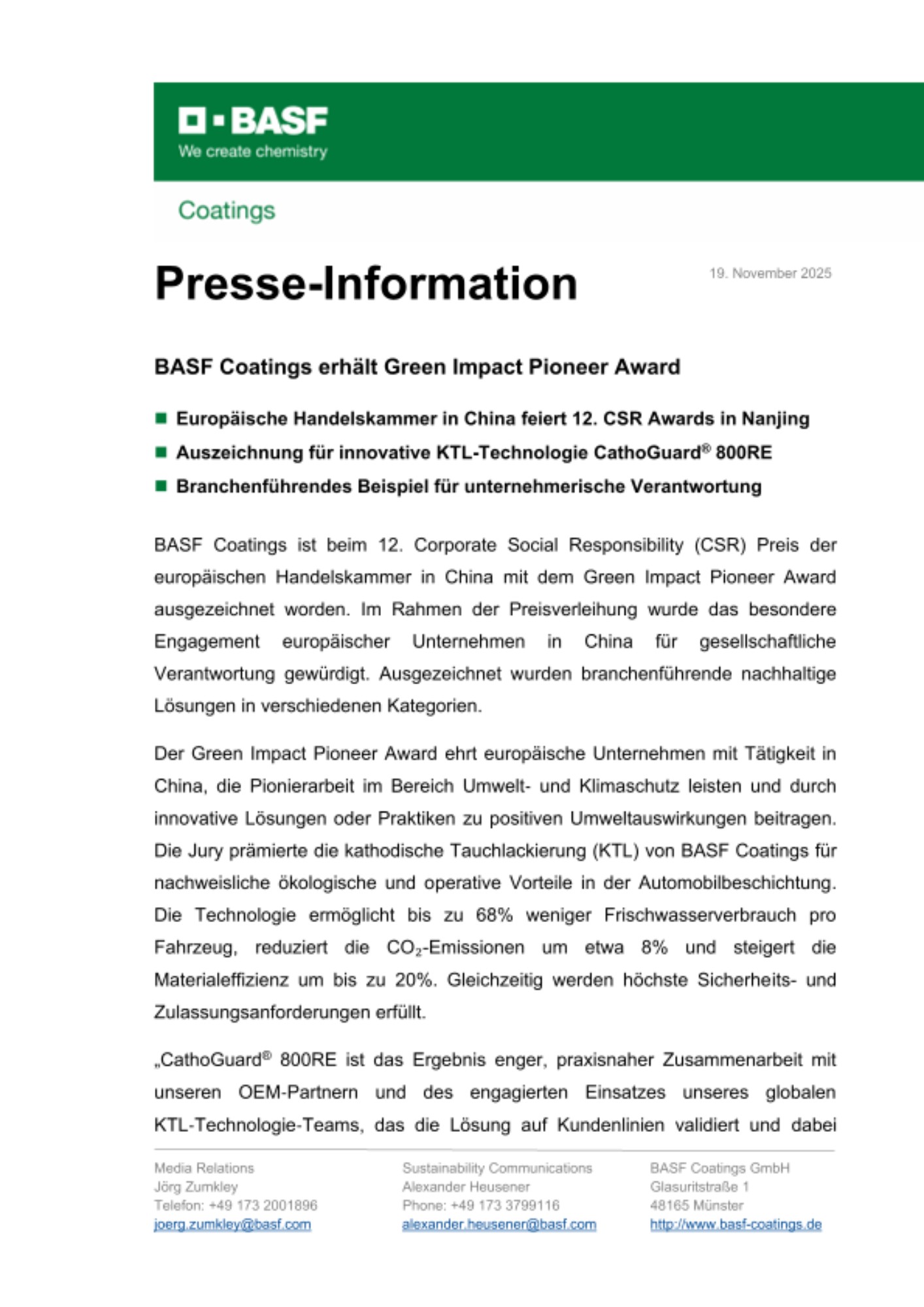 Der Green Impact Pioneer Award ehrt europäische Unternehmen mit Tätigkeit in China, die Pionierarbeit im Bereich Umwelt‑ und Klimaschutz leisten und durch innovative Lösungen oder Praktiken zu positiven Umweltauswirkungen beitragen. Die Jury prämierte die kathodische Tauchlackierung (KTL) von BASF Coatings für nachweisliche ökologische und operative Vorteile in der Automobilbeschichtung. Die Technologie ermöglicht bis zu 68% weniger Frischwasserverbrauch pro Fahrzeug, reduziert die CO₂-Emissionen um etwa 8% und steigert die Materialeffizienz um bis zu 20%. Gleichzeitig werden höchste Sicherheits- und Zulassungsanforderungen erfüllt.