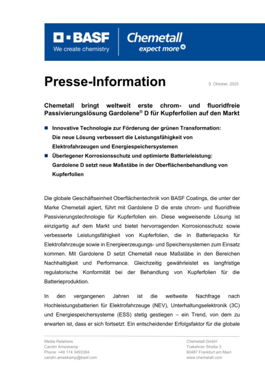 Die globale Geschäftseinheit Oberflächentechnik von BASF Coatings, die unter der Marke Chemetall agiert, führt mit Gardolene D die erste chrom- und fluoridfreie Passivierungstechnologie für Kupferfolien ein. Diese wegweisende Lösung ist einzigartig auf dem Markt und bietet hervorragenden Korrosionsschutz sowie verbesserte Leistungsfähigkeit von Kupferfolien, die in Batteriepacks für Elektrofahrzeuge sowie in Energieerzeugungs- und Speichersystemen zum Einsatz kommen. Mit Gardolene D setzt Chemetall neue Maßstäbe in den Bereichen Nachhaltigkeit und Performance. Gleichzeitig gewährleistet es langfristige regulatorische Konformität bei der Behandlung von Kupferfolien für die Batterieproduktion.