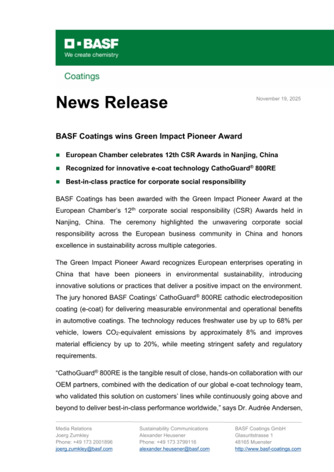 “We are proud that BASF Coatings and CathoGuard® 800RE are being recognized as a Green Impact Pioneer,” adds Stefanie Lang, Head of Global Sustainability - Automotive OEM Coatings at BASF. “This award highlights how our sustainable innovation creates a virtuous cycle, delivering both, measurable environmental and operational benefits while generating greater business value for our customers.”