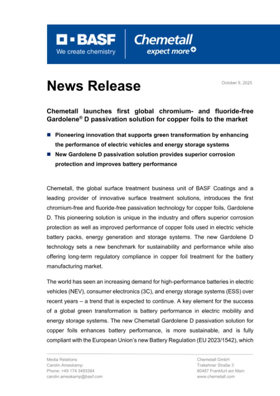 As the first surface treatment solutions provider to offer chromium-free and fluoride-free passivation technology for copper foil, Chemetall reaffirms its commitment to innovation, sustainability, and customer success. Gardolene D solutions for copper foil treatment are now available globally, enabling battery manufacturers to improve their processes and end-products through this next-generation technology without extra investments in existing operations.
