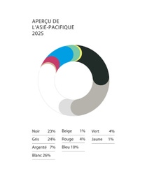 In 2025, the Asian Pacific region continues to lean toward achromatic dominance, with gray showing a clear upward trend, while white declines. Black and silver remain stable, reinforcing the enduring appeal of classic neutrals.