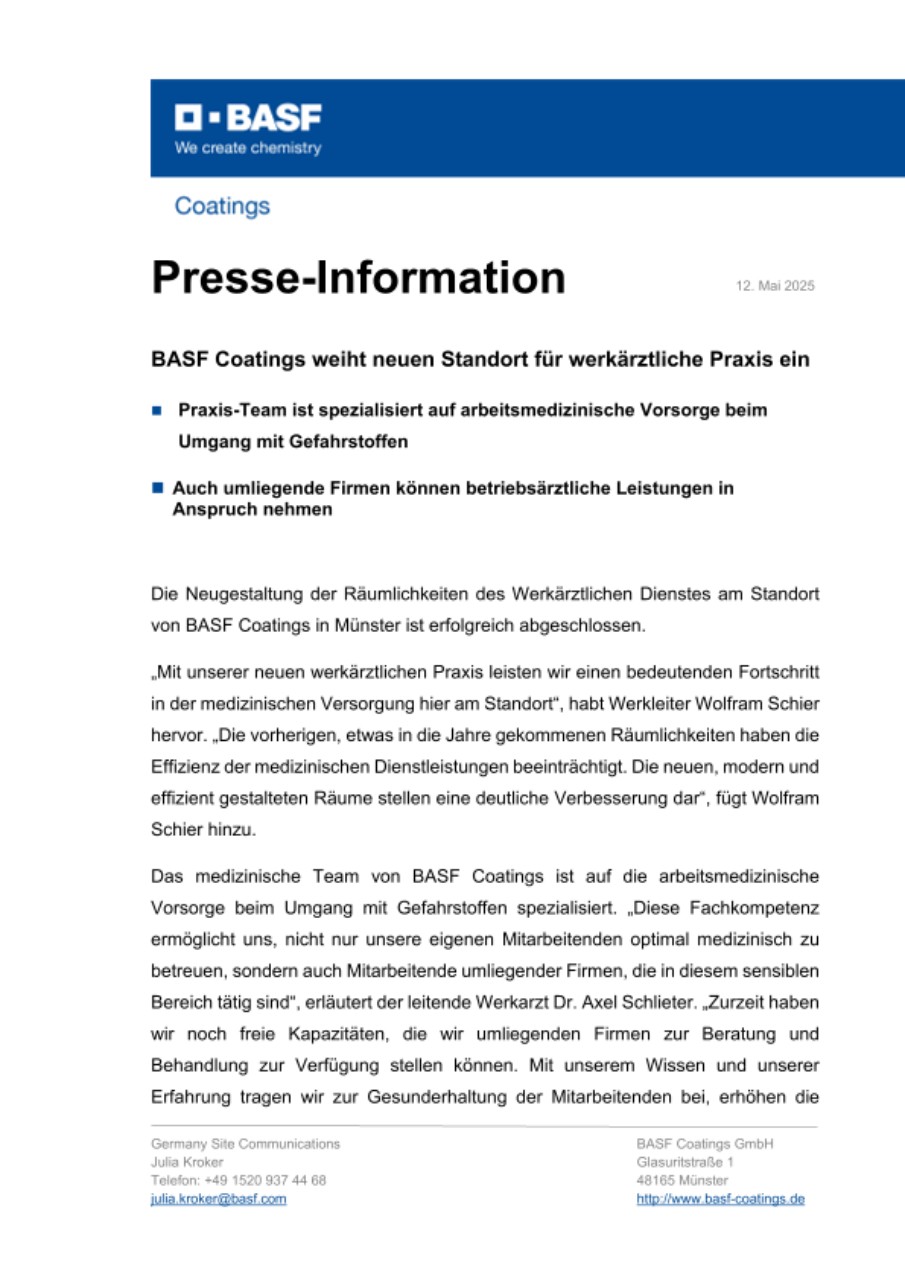 Bei Interesse an einer betriebsmedizinischen Beratung oder Betreuung freut sich das werkärztliche Team von BASF Coatings über eine Kontaktaufnahme unter +49 2501 14-2100.