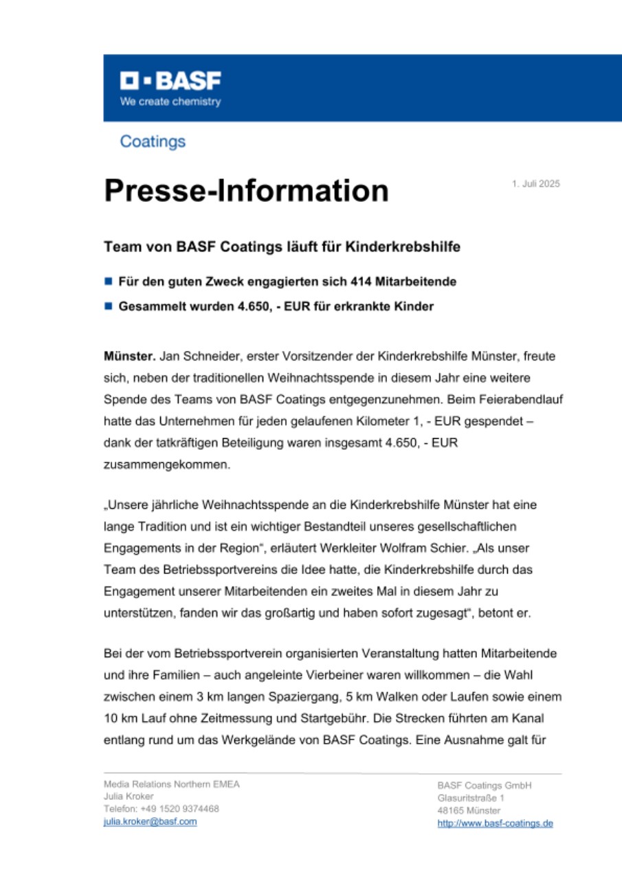 Münster. Jan Schneider, erster Vorsitzender der Kinderkrebshilfe Münster, freute sich, neben der traditionellen Weihnachtsspende in diesem Jahr eine weitere Spende des Teams von BASF Coatings entgegenzunehmen. Beim Feierabendlauf hatte das Unternehmen für jeden gelaufenen Kilometer 1, - EUR gespendet – dank der tatkräftigen Beteiligung waren insgesamt 4.650, - EUR zusammengekommen.