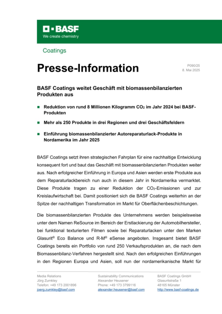 BASF Coatings setzt ihren strategischen Fahrplan für eine nachhaltige Entwicklung konsequent fort und baut das Geschäft mit biomassenbilanzierten Produkten weiter aus. Nach erfolgreicher Einführung in Europa und Asien werden erste Produkte aus dem Reparaturlackbereich nun auch in diesem Jahr in Nordamerika vermarktet. Diese Produkte tragen zu einer Reduktion der CO2-Emissionen und zur Kreislaufwirtschaft bei. Damit positioniert sich die BASF Coatings weiterhin an der Spitze der nachhaltigen Transformation im Markt für Oberflächenbeschichtungen.