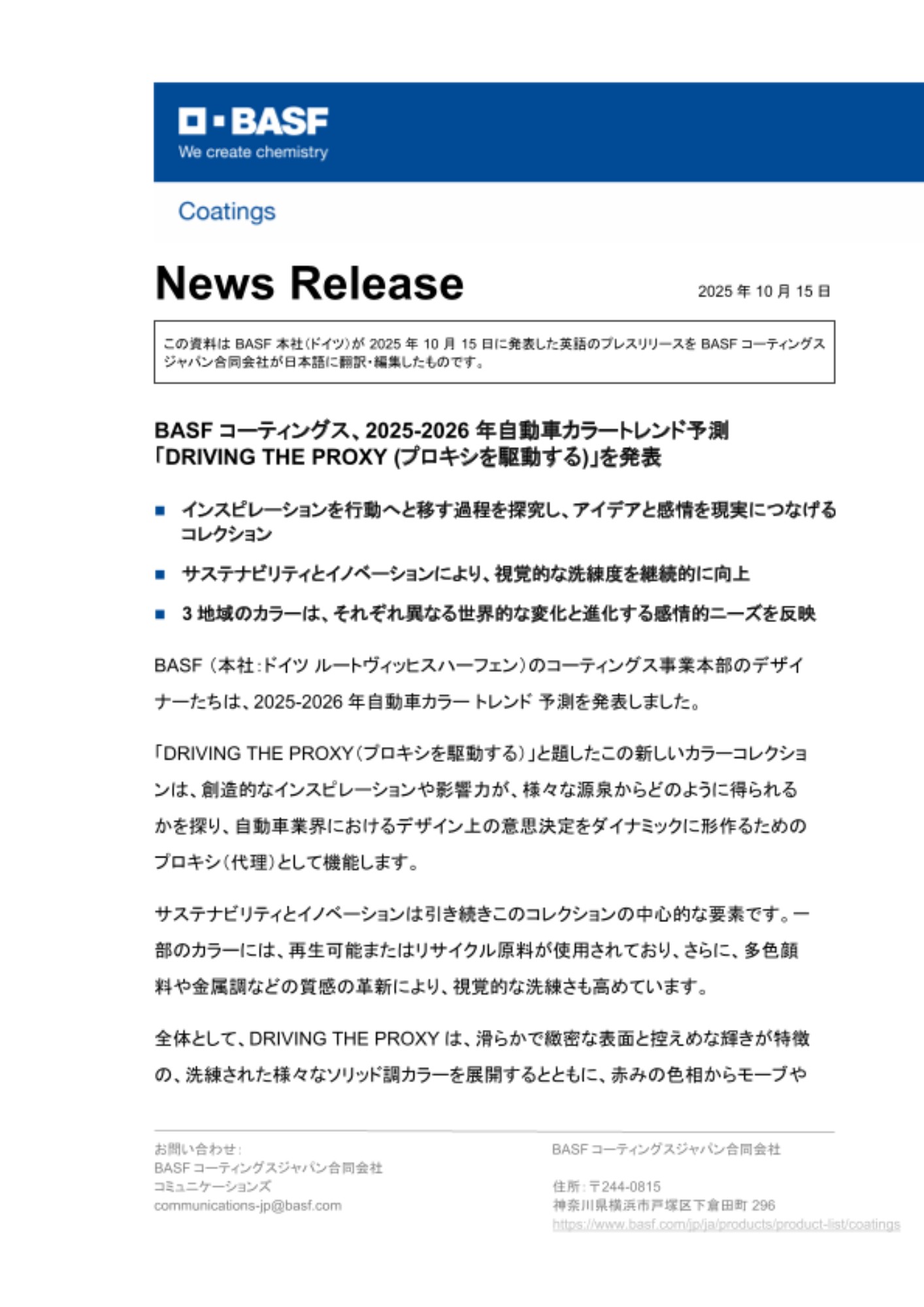 BASF コーティングス、2025-2026 年自動車カラートレンド予測 「DRIVING THE PROXY (プロキシを駆動する)」を発表