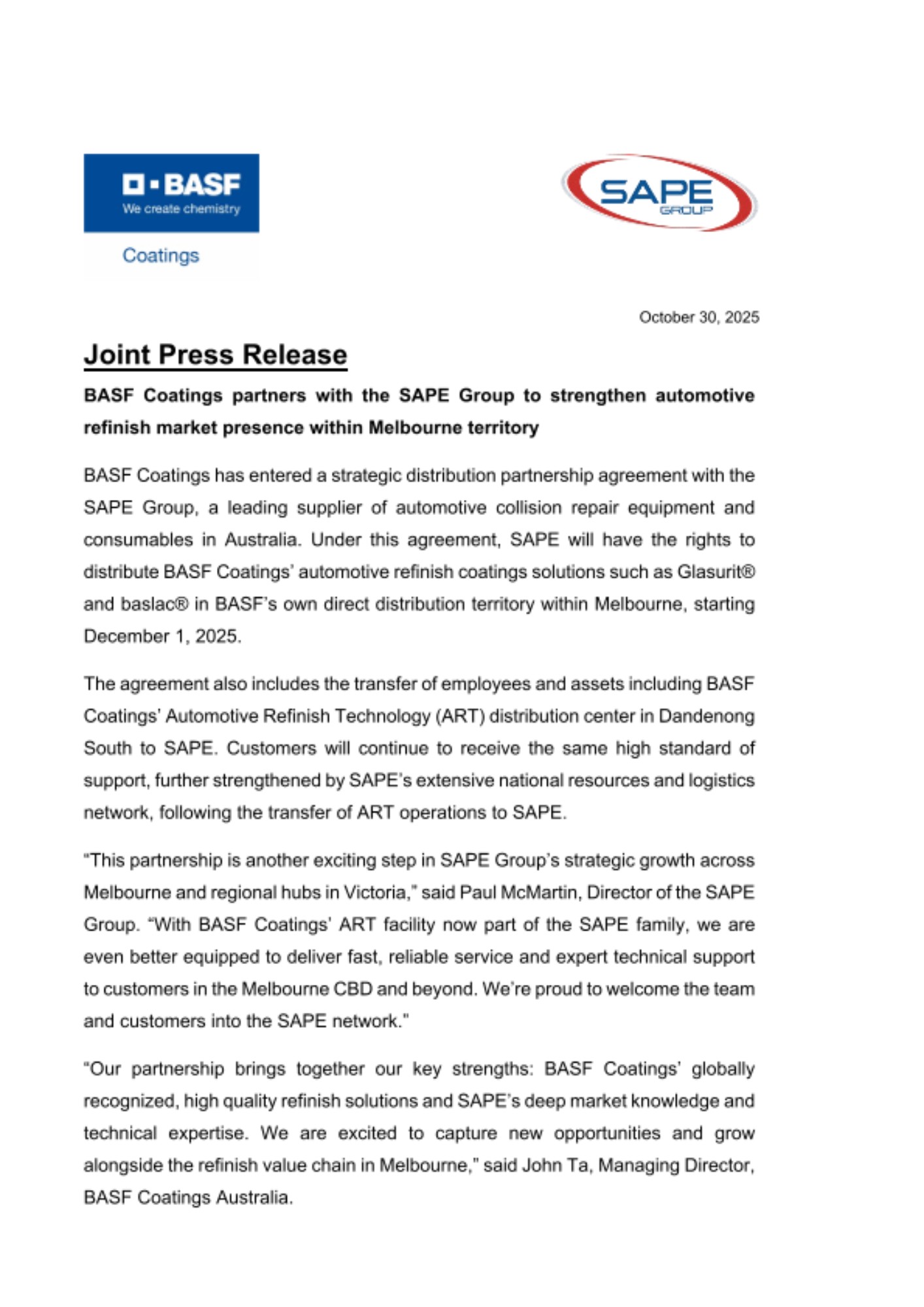 The agreement also includes the transfer of employees and assets including BASF Coatings’ Automotive Refinish Technology (ART) distribution center in Dandenong South to SAPE. Customers will continue to receive the same high standard of support, further strengthened by SAPE’s extensive national resources and logistics network, following the transfer of ART operations to SAPE.