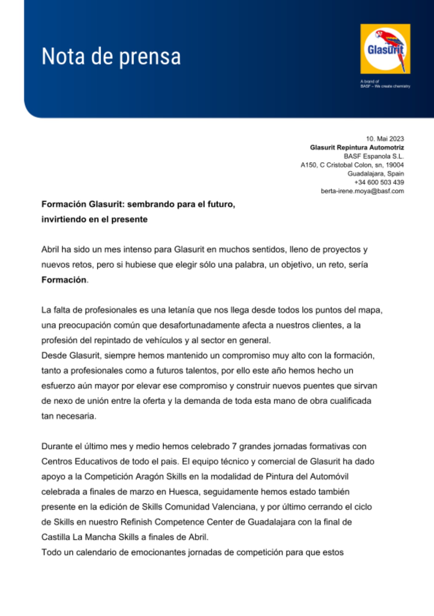 Desde Glasurit, siempre hemos mantenido un compromiso muy alto con la formación, tanto a profesionales como a futuros talentos, por ello este año hemos hecho un esfuerzo aún mayor por elevar ese compromiso y construir nuevos puentes que sirvan de nexo de unión entre la oferta y la demanda de toda esta mano de obra cualificada tan necesaria.