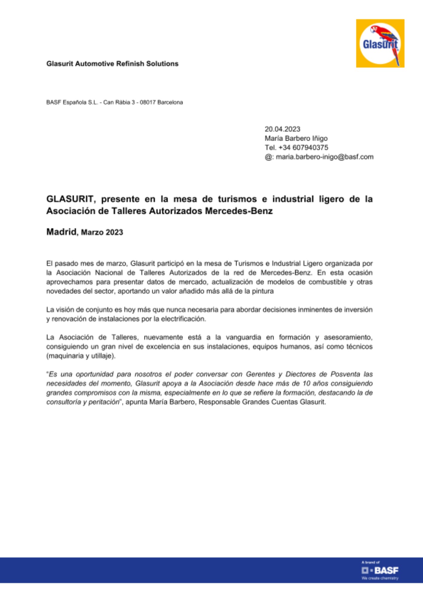 El pasado mes de marzo, Glasurit participó en la mesa de Turismos e Industrial Ligero organizada por la Asociación Nacional de Talleres Autorizados de la red de Mercedes-Benz. En esta ocasión aprovechamos para presentar datos de mercado, actualización de modelos de combustible y otras novedades del sector, aportando un valor añadido más allá de la pintura