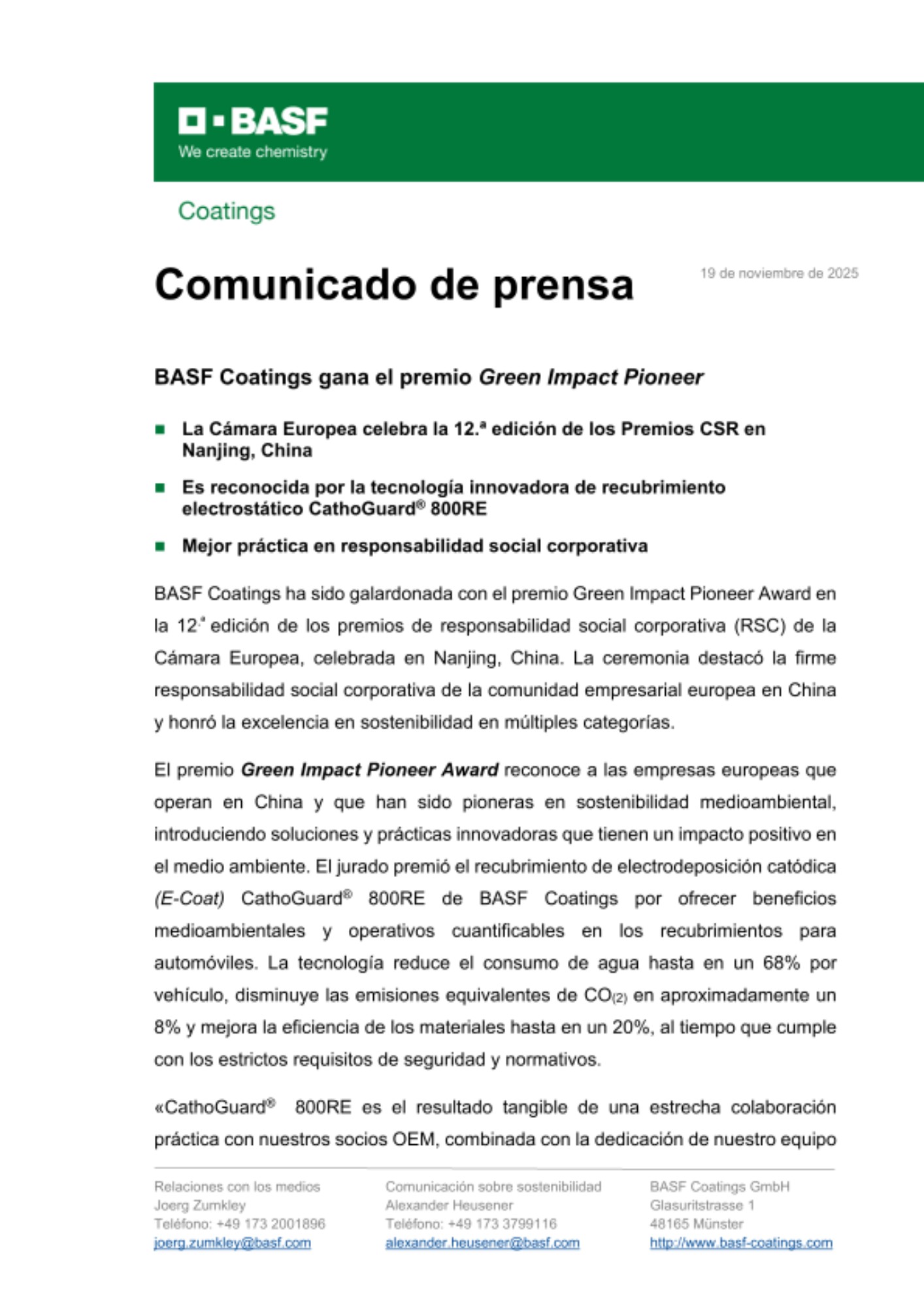 El premio Green Impact Pioneer Award reconoce a las empresas europeas que operan en China y que han sido pioneras en sostenibilidad medioambiental, introduciendo soluciones y prácticas innovadoras que tienen un impacto positivo en el medio ambiente. El jurado premió el recubrimiento de electrodeposición catódica (E-Coat) CathoGuard® 800RE de BASF Coatings por ofrecer beneficios medioambientales y operativos cuantificables en los recubrimientos para automóviles. La tecnología reduce el consumo de agua hasta en un 68% por vehículo, disminuye las emisiones equivalentes de CO(2) en aproximadamente un 8% y mejora la eficiencia de los materiales hasta en un 20%, al tiempo que cumple con los estrictos requisitos de seguridad y normativos.