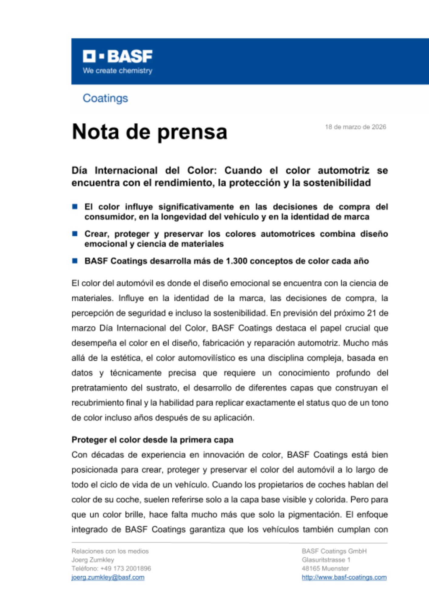 El color del automóvil es donde el diseño emocional se encuentra con la ciencia de materiales. Influye en la identidad de la marca, las decisiones de compra, la percepción de seguridad e incluso la sostenibilidad. En previsión del próximo 21 de marzo Día Internacional del Color, BASF Coatings destaca el papel crucial que desempeña el color en el diseño, fabricación y reparación automotriz. Mucho más allá de la estética, el color automovilístico es una disciplina compleja, basada en datos y técnicamente precisa que requiere un conocimiento profundo del pretratamiento del sustrato, el desarrollo de diferentes capas que construyan el recubrimiento final y la habilidad para replicar exactamente el status quo de un tono de color incluso años después de su aplicación.