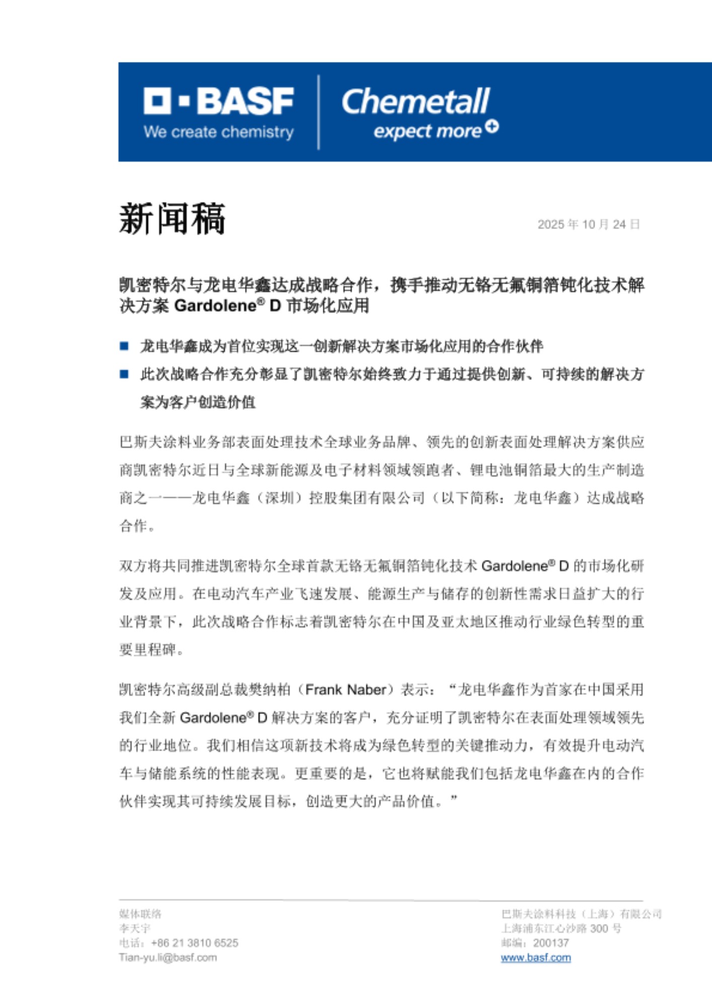 双方将共同推进凯密特尔全球首款无铬无氟铜箔钝化技术 Gardolene® D 的市场化研发及应用。在电动汽车产业飞速发展、能源生产与储存的创新性需求日益扩大的行业背景下,此次战略合作标志着凯密特尔在中国及亚太地区推动行业绿色转型的重要里程碑。