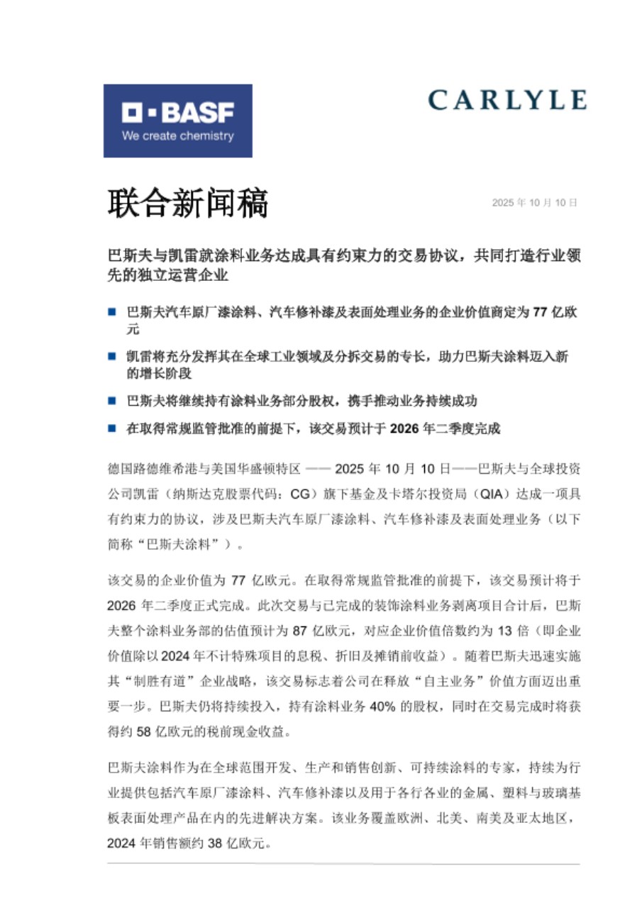 德国路德维希港与美国华盛顿特区 —— 2025 年 10 月 10 日——巴斯夫与全球投资公司凯雷(纳斯达克股票代码:CG)旗下基金及卡塔尔投资局(QIA)达成一项具有约束力的协议,涉及巴斯夫汽车原厂漆涂料、汽车修补漆及表面处理业务(以下简称“巴斯夫涂料”)。
