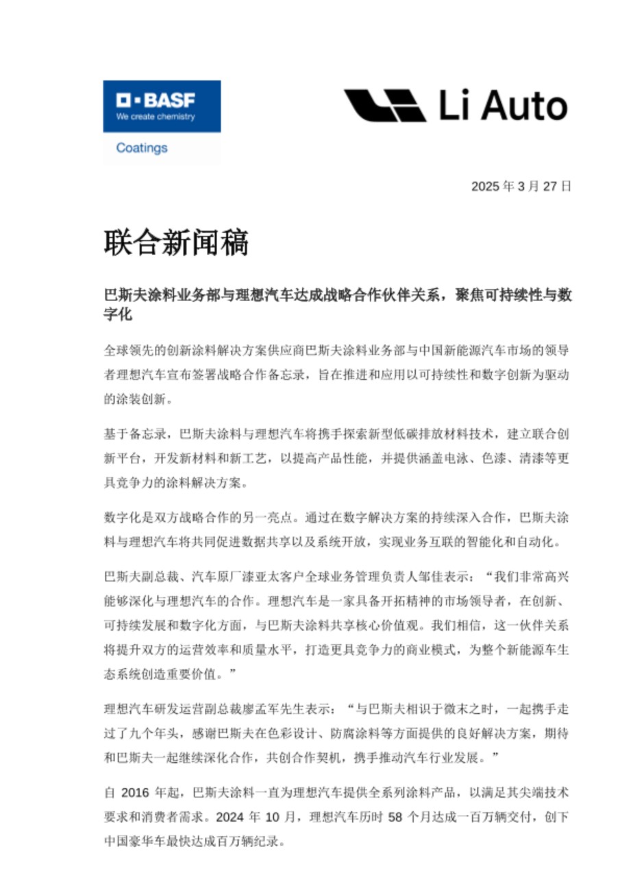 全球领先的创新涂料解决方案供应商巴斯夫涂料业务部与中国新能源汽车市场的领导者理想汽车宣布签署战略合作备忘录,旨在推进和应用以可持续性和数字创新为驱动的涂装创新。
