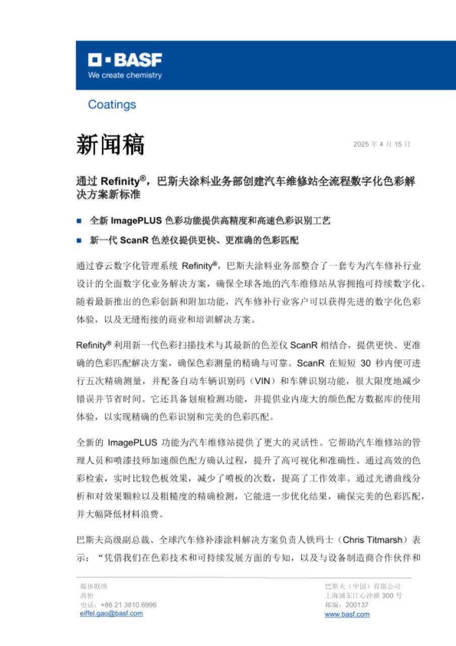巴斯夫高级副总裁、全球汽车修补漆涂料解决方案负责人铁玛士(Chris Titmarsh)表示:“凭借我们在色彩技术和可持续发展方面的专知,以及与设备制造商合作伙伴和客户的共同开发,Refinity® 将在各个方面提升汽车维修站的绩效。我们通过提供一流的睿云数字化解决方案,为全球客户提供无缝的数字色彩体验。”