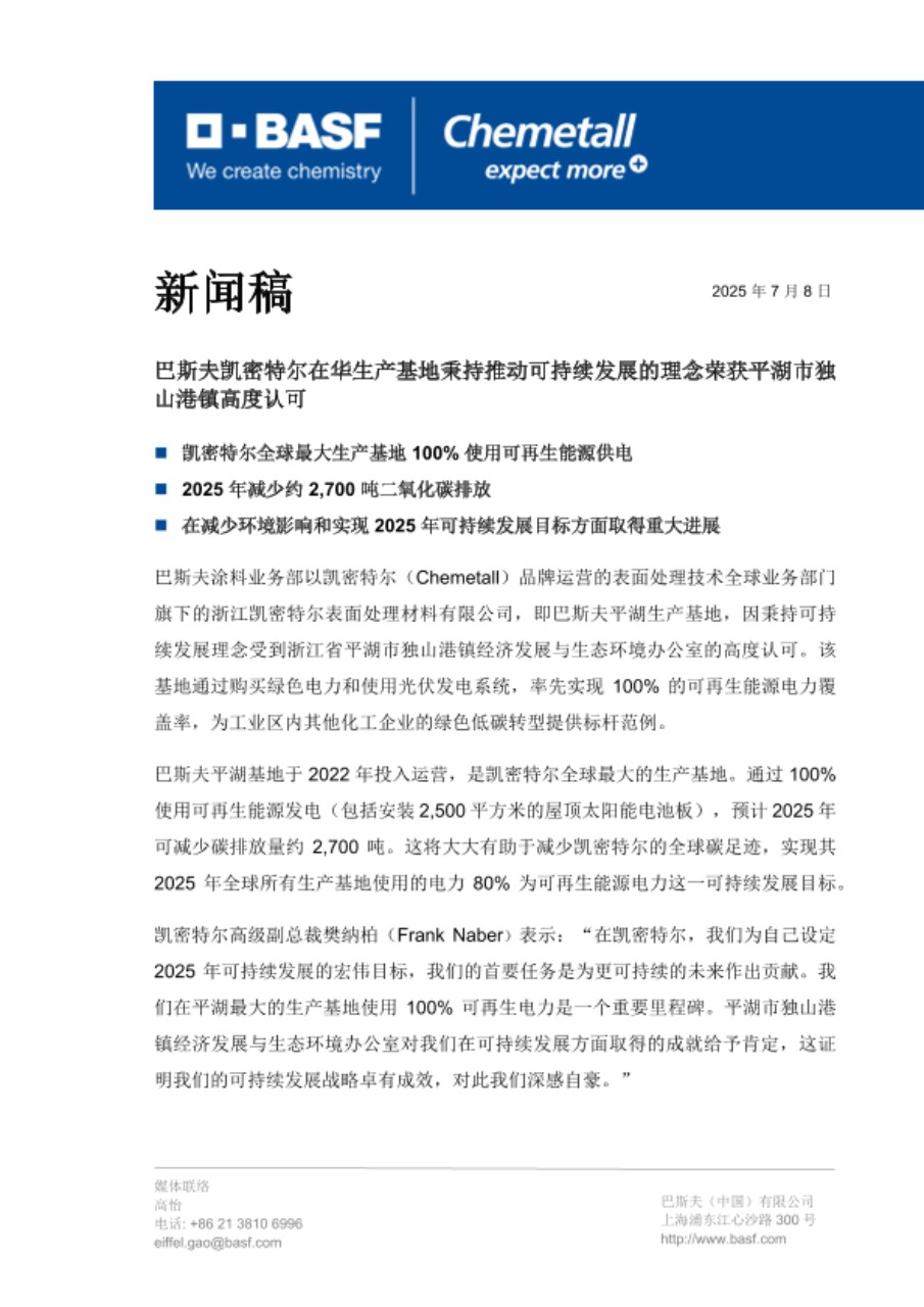 巴斯夫涂料业务部以凯密特尔(Chemetall)品牌运营的表面处理技术全球业务部门旗下的浙江凯密特尔表面处理材料有限公司,即巴斯夫平湖生产基地,因秉持可持续发展理念受到浙江省平湖市独山港镇经济发展与生态环境办公室的高度认可。该基地通过购买绿色电力和使用光伏发电系统,率先实现 100% 的可再生能源电力覆盖率,为工业区内其他化工企业的绿色低碳转型提供标杆范例。