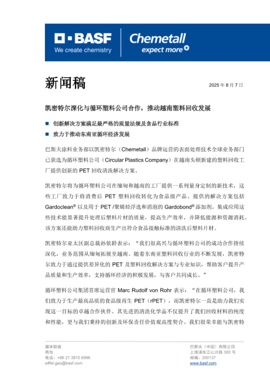循环塑料公司集团首席运营官 Marc Rudolf von Rohr 表示:“在循环塑料公司,我们致力于生产最高品质的食品级再生 PET(rPET),而凯密特尔一直是助力我们实现这一目标的卓越合作伙伴。其先进的清洗化学品不仅提升了我们回收材料的纯度和性能,更与我们秉持的创新及环保责任价值观高度契合。我们很荣幸能与凯密特尔这样的全球领导者携手,其解决方案与我们推动亚洲循环经济发展的愿景同样具有前瞻性。”